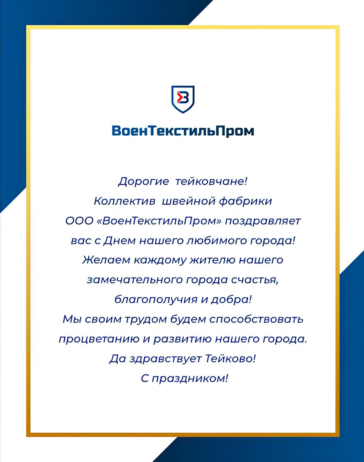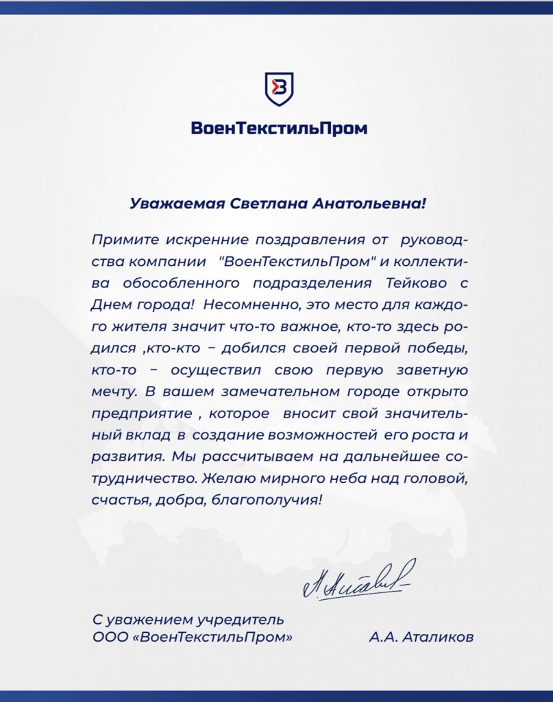 От имени руководства компании мы подготовили приветственный адрес на имя главы городского округа Тейково (Ивановской области) и поздравление от имени коллектива в местную газету «Наше время».